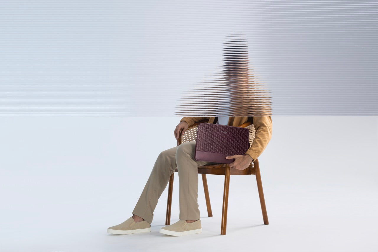 Unveil your professional mystique with the Enigma Laptop Bag. Its debossed geometric pattern is a nod to classic 1950’s noir-inspired refinement, capturing attention in any boardroom. Featuring a concealable trolley strap and a secure 14” laptop compartment, this briefcase combines sleek design with utility. Multiple pockets, including a quick-access back pocket for notes and tickets, enhance your travel experience. Complete with a cushioned shoulder pad and protective base studs, the Enigma laptop bag brings effortless elegance to your daily journey.